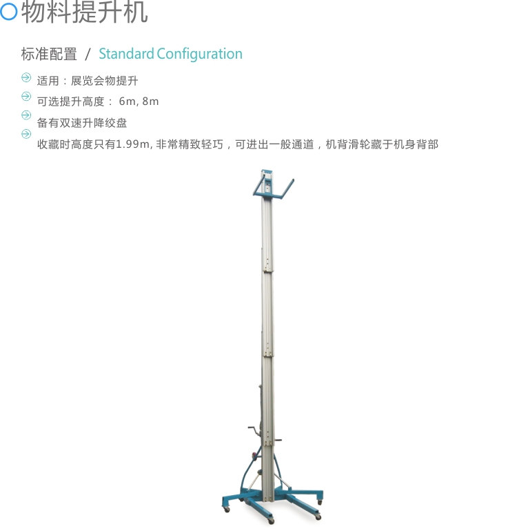 - 產品特點:備有雙速升降絞盤收藏時高度只有1.99m 非常精致輕巧,可進出一般通道,機背滑輪藏于機身背部有助于搬運上下貨車,方便運輸